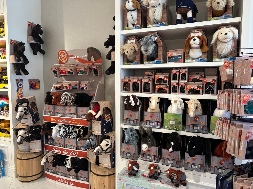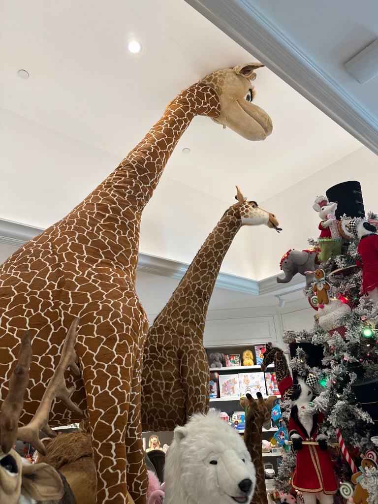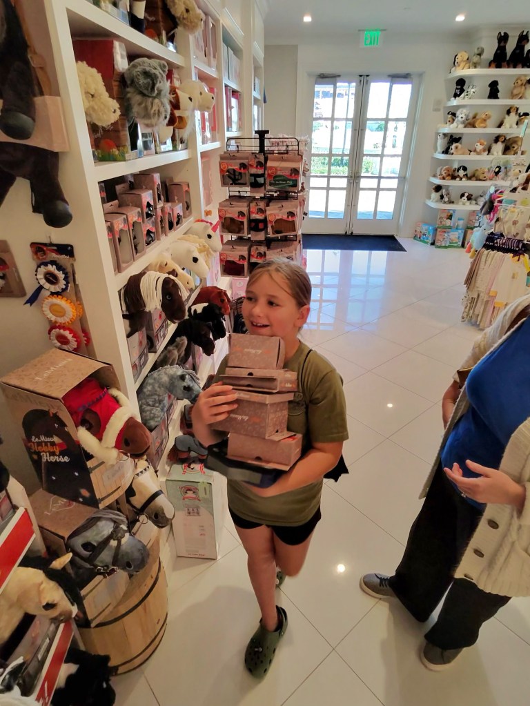 Our longest shopping visit was at Mr. Pickles & Sailor Bear Toy Shoppe, again in the hotel. Think a regular toy store, but with every horsey toy a little girl could dream of! So many Breyer horses, life size stuffed ponies, and Lemieux ponies & accessories for days. And for a bonus attraction for us older folks, they are home to the original Geoffrey the Giraffe, from Toys R Us!